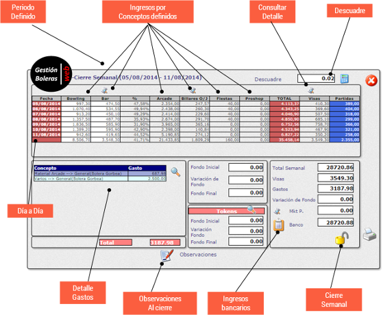 La acticidad principal está vinculada a un cierre diario que incluye diversos conceptos para el control de la actividad, permitiendo incluso informar al sistema las partidas y/o