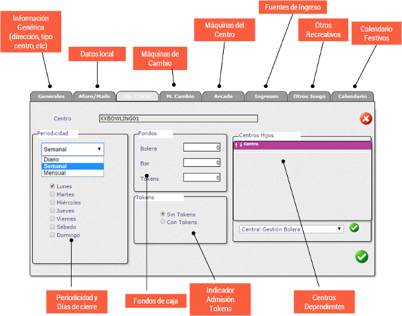 Dentro del módulo central, en la definición de cada uno de los centro se define el tipo de centro, así como la periodicidad del cierre o arqueo que se debe realizar en el centro.