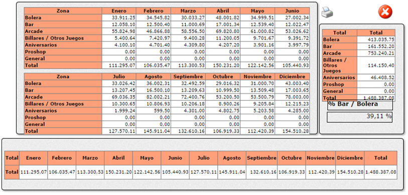 tales como Bar, Bolera, Máquinas recreativas, etc. y con sus comparativas de día, semana y mes anterior.